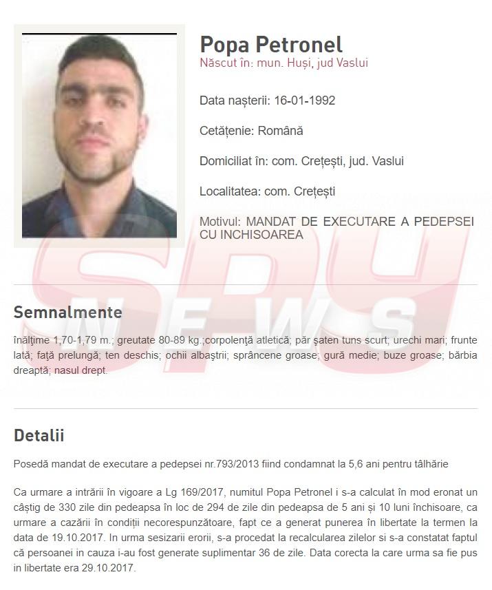 Cine sau dacă va plăti cineva pentru această "mică eroare", nu se ştie, însă un lucru este cert: poliţia încearcă, acum, să îl ducă înapoi, la "răcoare", pentru a-şi termina pedeapsa. "Posedă mandat de executare a pedepsei nr.793/2013 fiind condamnat la 5,6 ani pentru tâlhărie. Ca urmare a intrării în vigoare a Lg 169/2017, numitului Popa Petronel i s-a calculat în mod eronat un câștig de 330 zile din pedeapsa în loc de 294 de zile din pedeapsa de 5 ani și 10 luni închisoare, ca urmare a cazării în condiții necorespunzătoare, fapt ce a generat punerea în libertate la termen la data de 19.10.2017. In urma sesizarii erorii, s-a procedat la recalcularea zilelor si s-a constatat faptul că persoanei in cauza i-au fost generate suplimentar 36 de zile. Data corecta la care urma sa fie pus in libertate era 29.10.2017", este comunicatul emis de poliţie.