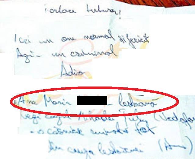 În biletul de adio lăsat de Codrin Geanopol era scris: ”Iertare tuturor! Ieri un om normal și fericit. Azi – un criminal. Adio. Ana-Maria M... - lesbiană. Vezi cazul ..... - o căsnicie ruinată tot din cauza lesbienei”. De altfel, imediat după ce și-a ucis iubita care ar fi avut o relație cu Ana-Maria M., Codrin Geanopol i-a trimis celui mai bun prieten un mesaj mai mult decât grăitor: ”Iubirea îți poate lua mințile. Nu pot trăi cu vina asta dar... am plănuit doar sinuciderea. În rest mi-a fost foarte greu. Simțeam că se chinuie. Voi rămâne o bestie, un sadic, dar nu știam cum să n-o doară. Să se termine. Ana a transformat-o. Așa și pe Mișu a rupt-o cândva de soțul ei. Lesbiana dracu'! Ăsta era secretul pe care îți ziceam că-l voi duce cu mine în mormânt. Nu era un altul, doar Ana. Raluca a văzut câteva SMS-uri, doar ei îi arătasem. Aveam și un telefon spion pe care l-am lăsat lângă ele. Acum comandasem altul de pe net. Se adeverea ce spunea Mădă - a facut inapta aia tot - a mințit-o, a tâmpit-o cu presupusele mele aventuri. Voi v-ați cam prins de ele, dar vă tot contraziceam. Eu n-am dreptul, nimeni n-are să ucidă. Indiferent... Dar ați văzut prin ce am trecut. Am devenit laș, slab după despărțire. Acum ucigaș. Mamă, dacă m-ai iubit, nu comite vreo imprudență. Distrusa aia a răpit-o. M-am urcat în mașină cu gândul să mor. Prima dată zic TIR, dar poate mai fac o victimă și poate scap. Zic metrou, dar am văzut că puțini scapă cu viață. Acum am găsit! Am iubit-o la nebunie. Cred ca am desfigurat-o pentru că am făcut tot cu ochii închiși. Doamne, nu eram în stare... Dacă da dracu' să nu mor, poate mă lăsati la aparate! Scoateți priza. Am fost și sunt lucid...”