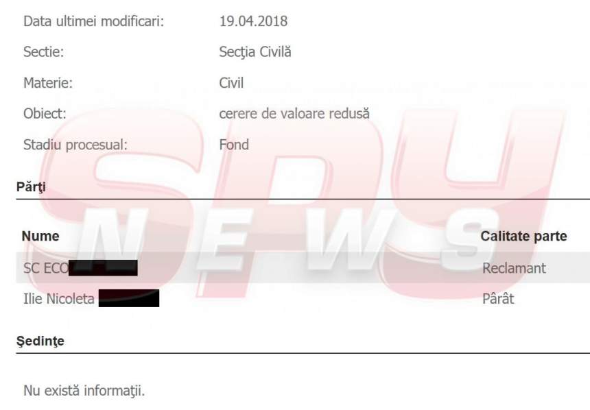 În urmă cu doi ani, fosta nevastă de fotbalist a pierdut un proces cu un anume Gigi S., căruia îi trăsese ţeapă cu 8.000 de euro. La momentul respectiv, creditorul a dat-o în judecată pe vedetă şi a obţinut executarea silită a acesteia. "Admite cererea formulată de reclamantul S. Gigi în contradictoriu cu pârâta Ilie Nicoleta, având ca obiect pretenţii. Obligă pârâta să plătească reclamantului suma de 8.000 EURO, reprezentând împrumut. Obligă pârâta să plătească reclamantului suma de 1.676 lei, cu titlu de cheltuieli de judecată, constând în taxă judiciară de timbru", au decis, atunci, magistraţii.