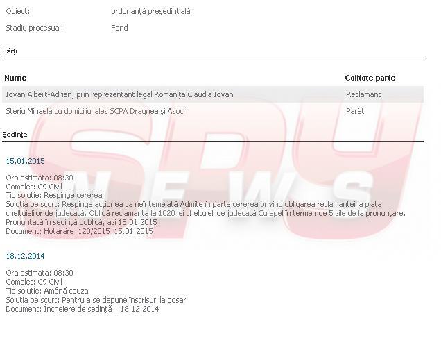 Potrivit deciziei instanţei, Romaniţa Iovan a pierdut procesul deschis pe numele Mihaelei Steriu, fosta iubită a pilotului Adrian Iovan. Cererea creatoarei de modă a fost respinsă ca neîntemeiată. În aceste condiţii, nici Romaniţa, nici fiul acesteia nu vor putea pătrunde în vila pilotului Adrian Iovan. O veste foarte proastă pentru fosta soţie a pilotului, la exact un an de la moartea acestuia. În plus, Romaniţa trebuie să plătească 1.020 de lei cheltuieli de judecată. În acelaşi timp, judecătorii nu au admis nici cererea de instituire a sechestrului judiciar depusă de Steriu. Deciziile nu sunt definitive.