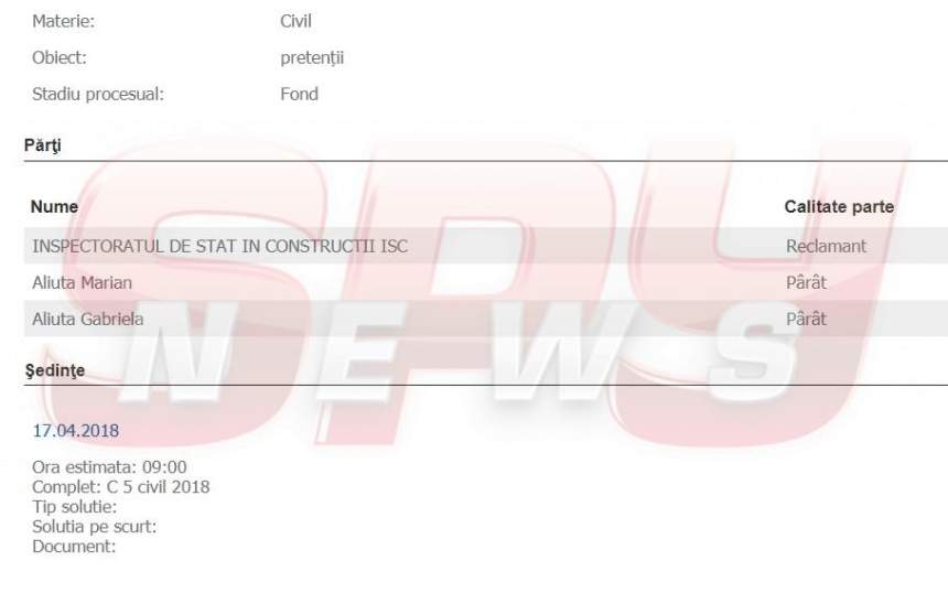 Gabriela şi Marian Aliuţă sunt citaţi să se prezinte luna viitoare la Judecătoria Sectorului 5, într-un dosar deschis de Inspectoratul în Construcţii – instituţie însărcinată cu depistarea clădirilor construite fără autorizaţii şi sancţionarea proprietarilor acestora. Dacă „Poliţia construcţiilor”, după cum este supranumită autoritatea amintită, va avea câştig de cauză, soţii Aliuţă ar putea fi nevoiţi să modifice sau chiar să demoleze clădirea care face obiectul procesului.