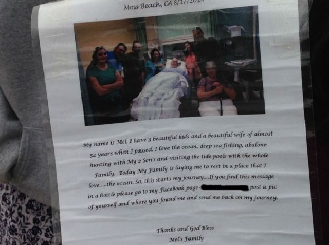 ”Numele meu este Mel. Aveam trei copii superbi și o soție în vârstă de 54 de ani, când am murit. Iubesc oceanul, iubesc pescuitul la apă adâncă, iubesc să merg la vânătoare cu cei doi copii ai mei și să vizitez fluxul și refluxul cu familia mea. Astăzi, familia mea m-a lăsat să mă odihnesc într-un loc pe care îl iubesc...oceanul. Așa pornește călătoria mea. Dacă găsești această sticlă, fă o poză cu tine și cu mesajul ăsta, pune-o pe pagina mea de Facebook și trimite-mă înapoi în călătoria mea”.