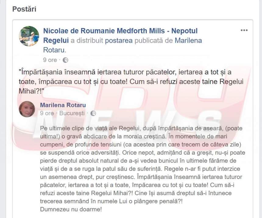 "Pe ultimele clipe de viață ale Regelui, după împărtășania de aseară, (poate ultima!) o gravă abdicare de la morala creștină. În momentele de mari cumpeni, de profunde tensiuni (ca acestea prin care trecem de câteva zile) se suspendă orice adversități. Orice nepot, admițând că a greșit, nu-și poate pierde dreptul absolut natural de a-și vedea bunicul în ultimele fărâme de viață și de a se ruga la patul său de suferință. Regele n-ar fi putut interzice un asemenea drept, pur creștinesc. Împărtășania înseamnă iertarea tuturor păcatelor, iertarea a tot și a toate, împăcarea cu tot și cu toate! Cum să-i refuzi aceste taine Regelui Mihai?! Cine își asumă dreptul să-i întunece trecerea semnând în numele Lui o plângere penală?! Dumnezeu nu doarme!", este mesajul integral, postat de jurnalista Marilena Rotaru, care l-a impresionat pe fostul principe.