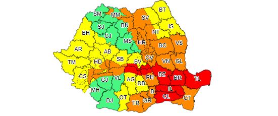 UPDATE 11.40: Meteorologii au prelungit codurile transmise în această dimineaţă. ANM a anunţat noi coduri, dintre acestea unul fiind galben, trei portocalii şi două roşii. Toate codurile sunt valabile de astăzi până joi, la ora 08.00, mai puţin unul portocaliu, care va intra în vigoare joi dimineaţă, la ora 08.00 şi rămâne valabil până la ora 12.00.