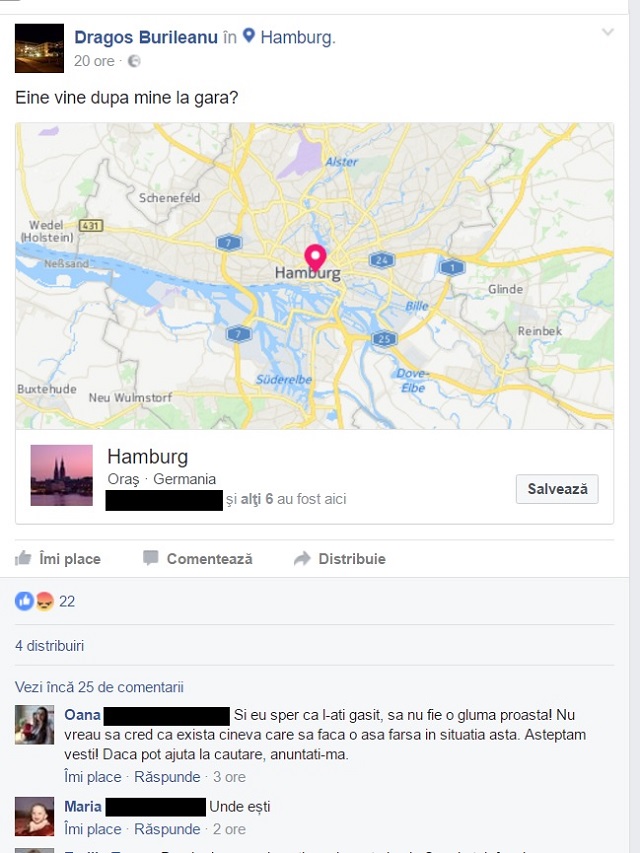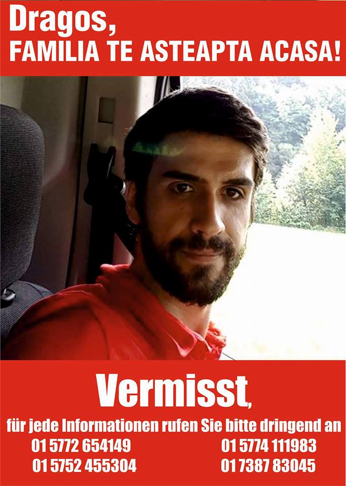 Potrivit rudelor disperate, Dragoş Burileanu, de 28 de ani, din Reşiţa, a dispărut fără urmă în Germania şi este căutat de mai bine de o săptămână. "Dragoş lucrează în Germania la o firmă de curierat. Pe 26 septembrie s-a decis să îşi viziteze iubita, care are un loc de munca în Hamburg. La intoarcere, însă, noaptea târziu, Dragoş şi-a sunat rudele şi le-a spus că are nevoie de ajutor pentru că a rămas fără maşină şi fără acte. Apoi a postat pe Facebook o fotografie cu un spital, sub care a scris AJUTOR", au povestit apropiaţii care încearcă să îl găsească pe tânăr, conform soferidinromania1.blogspot.ro. Rudele au încercat imediat să îl contacteze, dar telefonul lui era deja închis, aşa că familia a sesizat poliţia din Germania, care nu a făcut mare lucru pentru localizarea dispărutului.