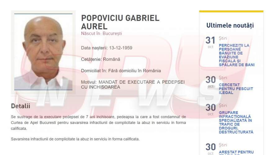 Puiu Popoviciu a fost condamnat definitiv, în 2 august, la șapte ani de închisoare pentru complicitate la abuz în serviciu și dare de mită în dosarul Ferma Băneasa, vizând fapte legate de tranzacționarea la un preț subevaluat a unui teren de 224 de hectare de la Universitatea de Științe Agronomice și Medicină Veterinară (USAMV) București, prin care s-au produs prejudicii de peste 335 de milioane de lei statului și aproape 620 de milioane de lei USAMV, potrivit profit.ro. Întrucât nu s-a prezentat la Poliție și nici nu a fost găsit de anchetatori pentru executarea pedepsei, Popoviciu a fost dat în urmărire internațională, figurând chiar şi ieri pe lista celor mai căutaţi infractori.