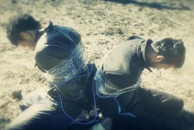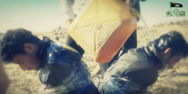 Cei doi prizonieri din această imagine sunt legaţi spate în spate cu nişte cabluri. Tot în această fotografiei se vede cum o a treia persoană varsă benzină pe ei, cei doi fiind în orice clipă la un pas de o explozie uriaşă.