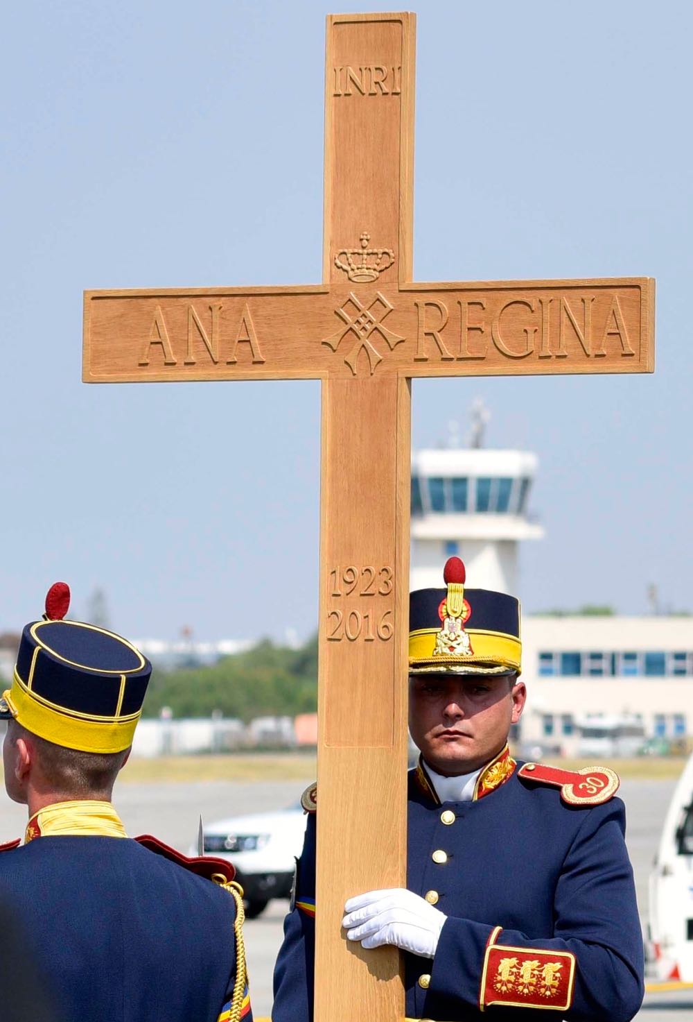 La ora 10.55, militarii Brigăzii de Gardă 30 Mihai Viteazul vor purta sicriul acoperit cu stindardul Reginei şi îl vor aşeza pe catafalcul din Piaţa Palatului Regal. La ora 11, Înalt Preasfinţia Sa Arhiepiscopul Ioan Robu, Mitropolit Romano-Catolic de Bucureşti, va conduce slujba religioasă, având alături ierarhi şi un sobor de preoţi catolici. Ceremonia va avea loc în prezenţa ierarhilor Bisericii Ortodoxe Române.