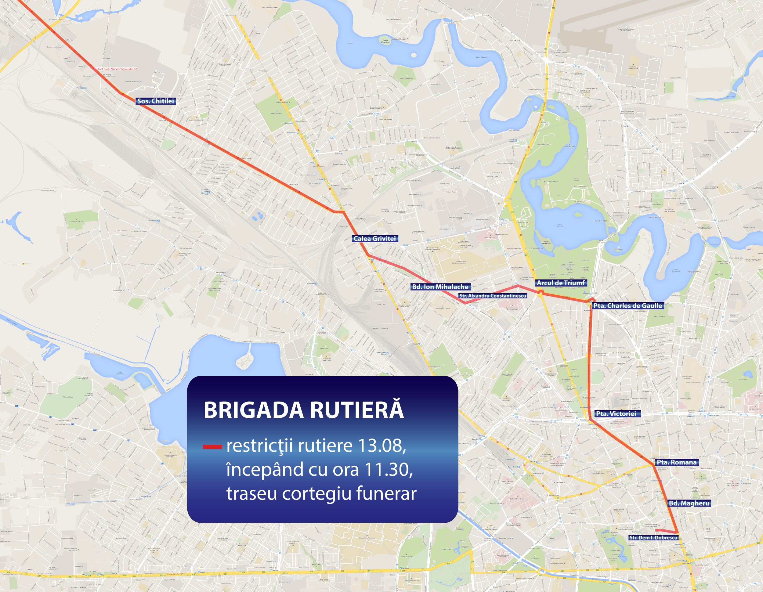 De la ora 11.35 la ora 12, Cortegiul funerar va merge cu viteză redusă pe traseul Piaţa Palatului Regal – Bulevardul Magheru – Piaţa Romană – Piaţa Victoriei – Bulevardul Aviatorilor – Piaţa Charles de Gaulle – Arcul de Triumf. La Arcul de Triumf nu va avea loc nicio oprire şi nu se va face slujbă religioasă.