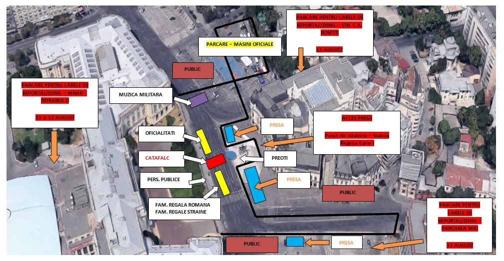 În Piaţa Palatului Regal, la ora 11, va avea loc o ceremonie funerară militară şi religioasă. Accesul publicului în Piaţa Palatului este liber, în zonele special amenajate pentru participanţi.