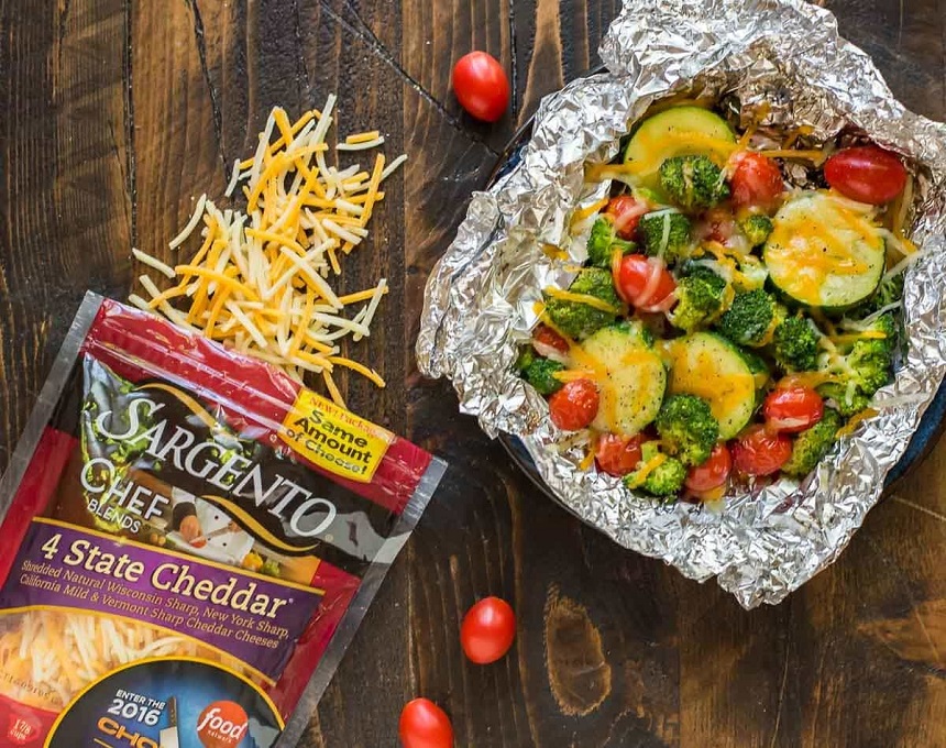 Se decupează cu o foarfecă patru pătrate dintr-o folie de aluminiu și apoi se lasă deoparte . Într-un castron mare, se pun roşiile, broccoli, feliile de dovlecel, apoi se amestecă cu ulei de măsline, pudră de usturoi, sare şi piper. Se aşează legumele, în mod egal în fiecare pătrat din folie de aluminiu și se împachetează.