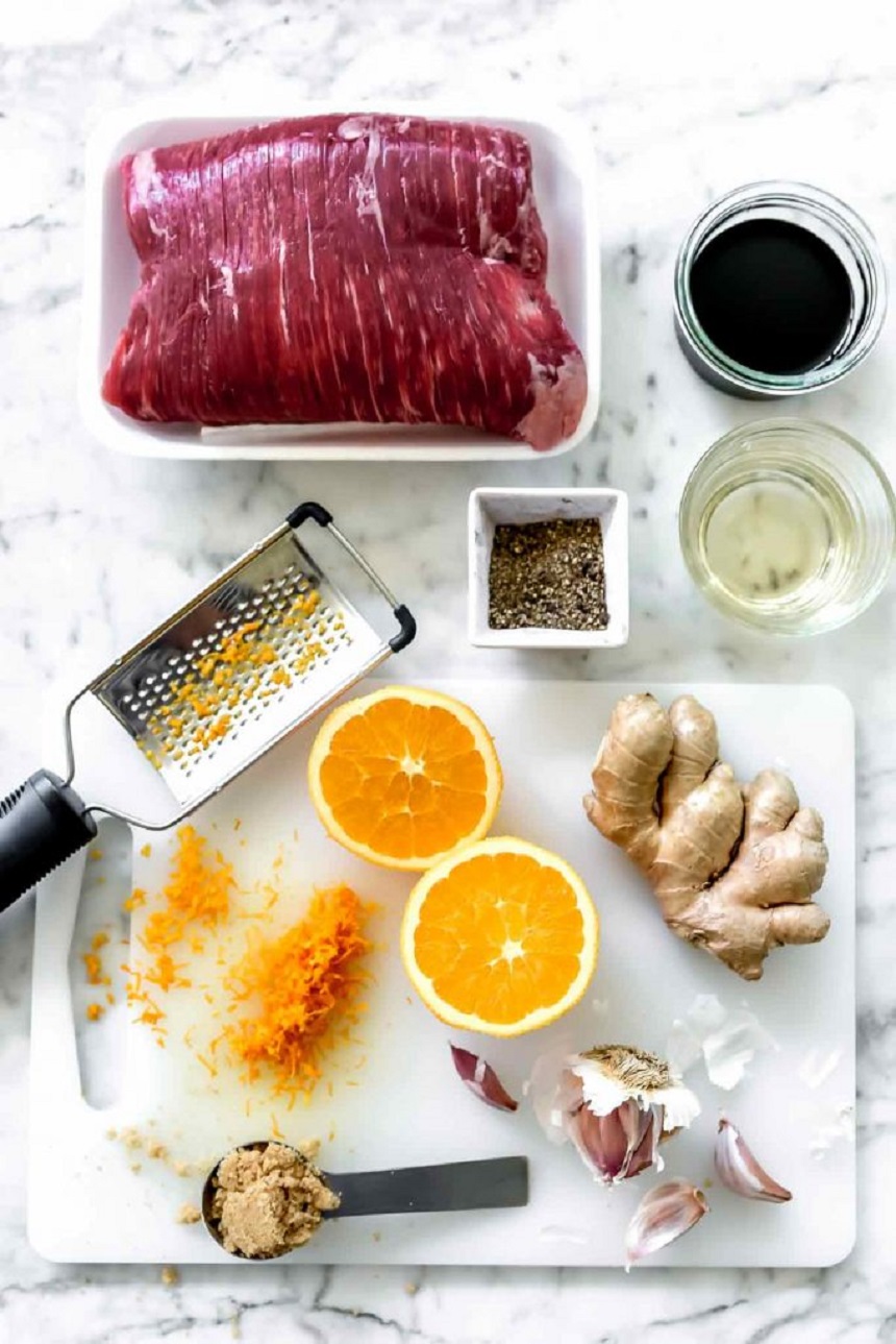 Se rad portocalele de coajă, aproximativ patru linguri. Două linguri se adaugă într-o pungă de congelator, iar celelalte se pun în vasul unui blader. Se storc portocalele şi se adaugă sucul în punga de congelator. Se adaugă uleiul de rapiţă şi cinci căţei de usturoi în pungă. Se împarte ghimbirul în două, jumătate se pune în blader, iar jumătate în punga de congelator. Se adaugă sosul de soia și zahărul brun. Se adaugă carnea de porc şi se sigilează punga. Este recomadat și se lasă peste noapte la frigider. În blader adăugaţi oţetul, uleiul de susan şi frunzele de busuioc, mentă şi patrunjel mixaţi până ce toate ingredientele se combină perfect. Apoi se lasă la refrigerat.