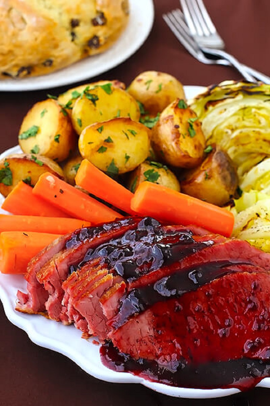 La final, se scoate carnea din cuptor şi se lasă timp de 15 minute să se odihnească înainte de a se porţiona. Se asezonează cu glazura de mure şi se serveşte alături de legume coapte.
