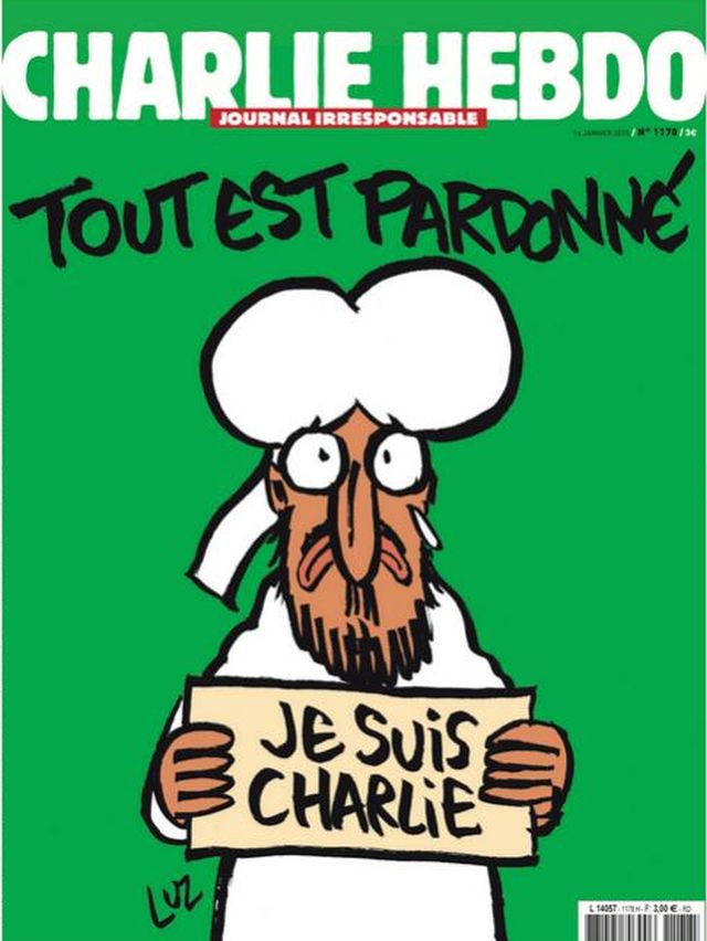 Coperta primului număr al revistei după atacurile de la sediul publicației va reprezenta o caricatură a profetului Mahomed, care plânge. Profetul ține în mâini o hârtie pe care este scris mesajul ”Je suiș Charlie”, iar deasupra desenului este scris ”Tout est pardone” (n.r. ”Totul este iertat”), potrivit celor de la Business Insider, citat de Mediafax.