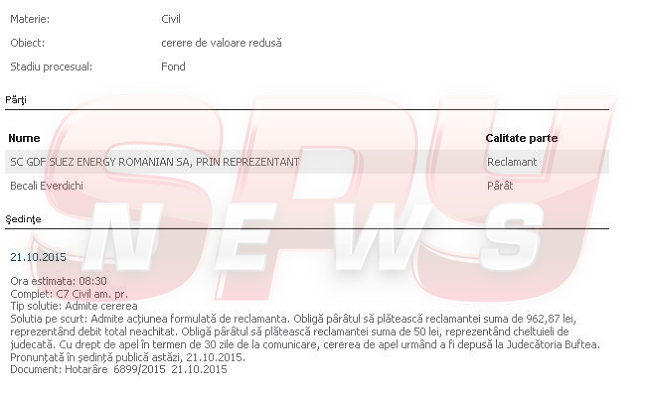 Chiar dacă nu mai este printre noi, femeia nu a scăpat de facturile neplătite. Surprinzător, Judecătoria Buftea a admis ieri, o acţiune formulată de societatea care se ocupă de distribuţia gazului natural şi a obligat-o (postmortem) pe mama milionarilor Ioan şi Victor Becali la plata sumei de 962,87 lei - sumă ce reprezintă facturi neachitate. În plus, "trebuie" să "plătească reclamantei suma de 50 lei, reprezentând cheltuieli de judecată".