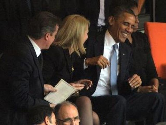 La ceremonia dedicată lui Nelson Mandela, trei dintre cei mai puternici oamenii din lume au ţinut să-şi facă simţită prezenţa, însă printr-un gest destul de nepotrivit momentului. Barack Obama, preşedintele american împreună cu Helle Thorning Schmidt, premierul danez şi David Cameron, premierul britanic au fost surprinşi lângă o blondă în ipostaze destul de ciudate. Oamenii care au sesizat acest lucru au rămas fără cuvinte.