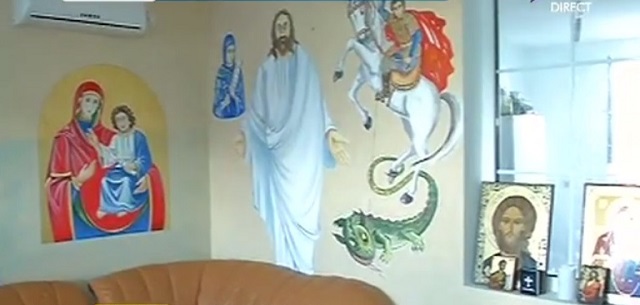 Mai mult decât atât, Puiu Mudava a reuşit să îşi facă în propria sufragerie un adevărat altar şi pereţii sunt împânziţi de sfinţi pictaţi în dimensiuni impresionante.