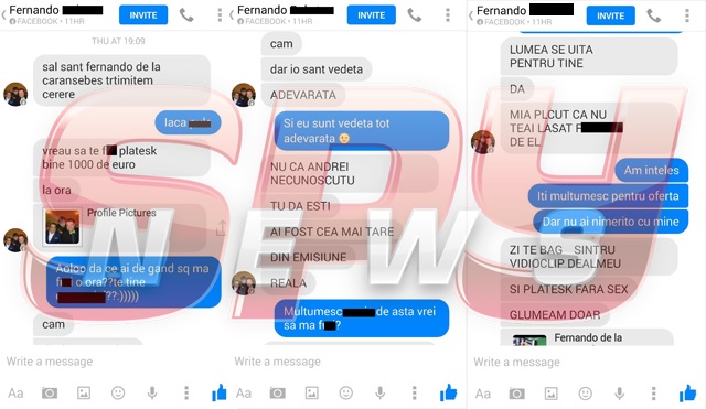 Fernando de la Caransebeş, iremediabil îndrăgostit de fosta concurentă, a acţionat imediat, printr-o scurtă introducere şi ”o ofertă de nerefuzat”. O oră de neuitat, în aşternuturile lui, în schimbul unei sume ”frumușele”. 1.000 de euro! Atât era în stare cântăreţul să îi acorde Roxanei pentru favoruri sexuale. În stilul caracteristic, individul a crezut că o va impresiona pe brunetă, însă nici măcar statutul lui de vedetă nu a înduplecat-o pe Roxana. "Eu sunt vedetă adevărată, nu ca Andrei Necunoscutul. Ai fost cea mai tare din emisiune! Ai fost reală. Lumea se uita pentru tine", i-a scris Fernando, curajos.