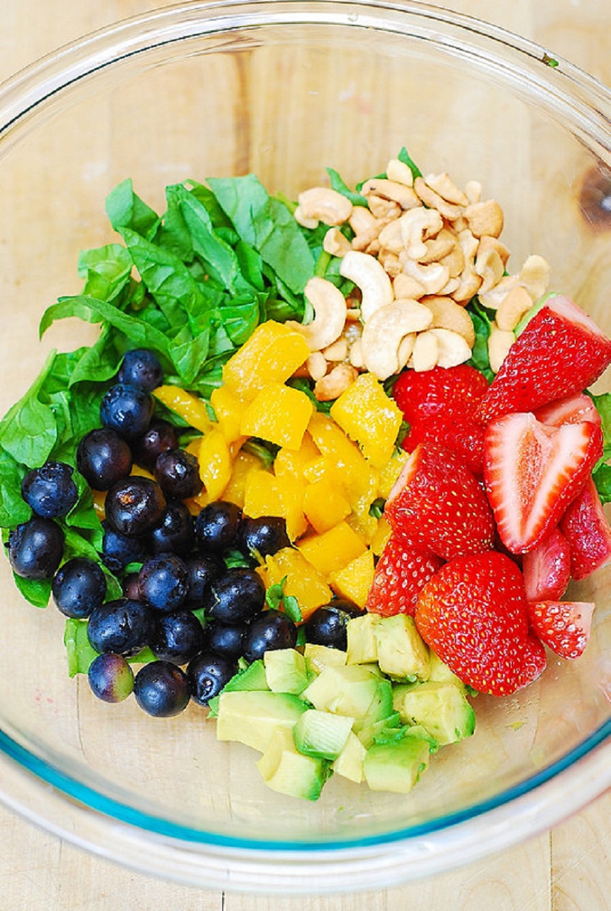 Într-un castron mediu se combină uleiul de măsline, oţetul balsamic, zahărul brun, praful de usturoi, praful de muştar şi esenţa de ceapă. Se asezonează cu sare şi piper şi se refrigerează timp de aproximativ 30 de minute. Într-un castron mare se combină spanacul, căpşunele, avocado, afinele şi Mango. Se adaugă amestecul de ulei şi oţet şi se amestecă până ce toate acestea se combină perfect. Se presară cajou-ul şi se serveşte imediat.