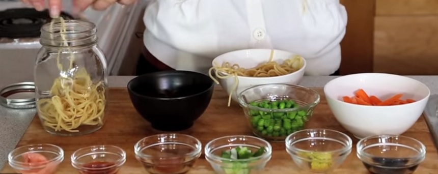 Se combină toate ingredientele într-un borcan. Pentru a servi, se adaugă apă fiartă, cât să acopere tăiţei şi legumele, apoi se lasă deoparte câteva minute. Se serveşte imediat.