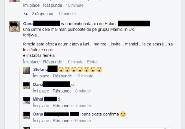 Raluca, o proaspătă mămică originară din România plecată la muncă în Marea Britanie, a invitat la ea acasă mai multe conaţionale cu bebeluşi, făcându-le acestora o propunere care avea să le şocheze pe musafire. Dezvăluirile au fost făcute de o altă româncă, Oana, pe un grup virtual destinat mămicilor, unde aceasta a explicat că "Raluca este una dintre cele mai mari psihopate de pe grupul Mămici în UK. Femeia asta oferea acum câteva luni - mă rog, invita mămici la ea acasă -, să le alăpteze copiii! E instabilă femeia!"