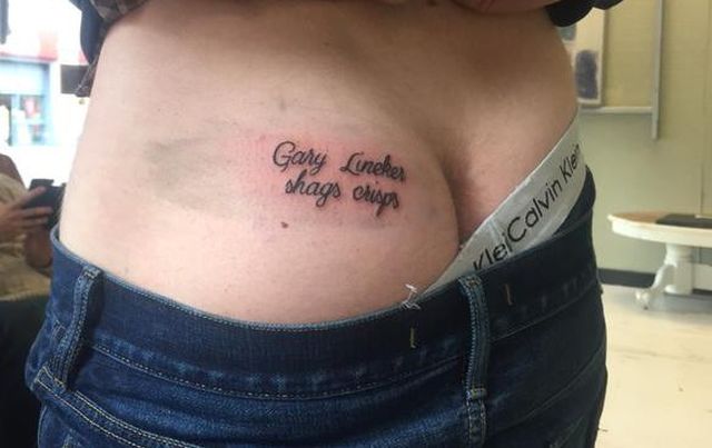 Pe 29 iunie, Jonno Scott din Marea Britanie a apelat la un specialist în tatuaje pentru a-i desena pe posterior mesajul ‘Gary Lineker shags crisps’. Microbist înrăit şi fan al fostului jucător de fotbal tânărul a vrut să impresioneze cu tatuajul său, dar mai mult s-a făcut de râs.