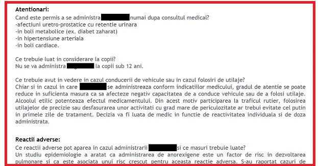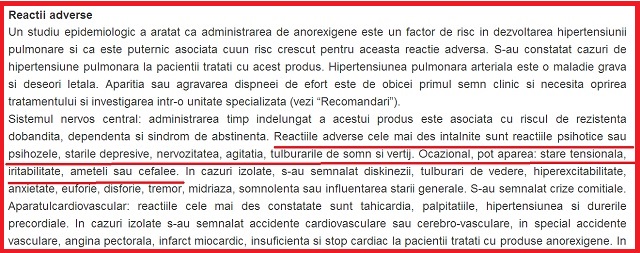 Pe lângă faptul că persoanele care folosesc medicamentul "minune" sunt expuse unor riscuri uriaşe de atac cerebral şi infarct, în prospectul acestuia se menţionează, la rubrica "Reacţii adverse": "Reacţiile adverse cele mai des întâlnite sunt reacţiile psihotice sau psihozele, stările depresive, nervozitatea, agitaţia, tulburările de somn şi vertij. Ocazional, pot apărea: stare tensională, iritabilitate, ameţeli sau cefalee. În cazuri izolate, s-au semnalat diskinezii, tulburări de vedere, hiperexcitabilitate, anxietate, euforie, disforie, tremor, midriază, somnolenţa sau influenţarea stării generale".