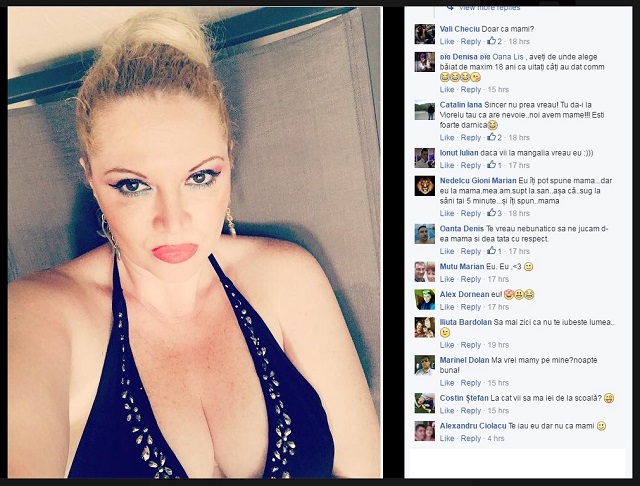 Totul a început marţi noapte, când soţia lui Viorel Lis a postat în spaţiul virtual o fotografie în care apărea cu decolteul generos la vedere, întrebând: "Deci, cine mă vrea ca mami... pentru mâine?!" (făcând referire la Ziua internaţională a copilului - n.r.). Aşa cum era de aşteptat, fotografia a fost extrem de apreciată de puştanii în călduri, iar mulţi dintre ei nu s-au putut abţine şi au mărturisit că "s-ar băga". Cu nişte condiţii. "Eu îți pot spune mama... Dar eu la mama mea am supt la sân... Așa că... sug la sânii tăi 5 minute... și îți spun... mama", i-a făcut o ofertă un puştan care n-a împlinit încă 18 ani. "Te vreau, nebunatico, să ne jucăm de-a mama şi de-a tata. Cu respect", i-a spus un altul, plin de... respect. Cireaşa de pe tort a venit, însă, nu din partea unui şcolar plin de coşuri, ci din partea unei tinere din Giurgiu.