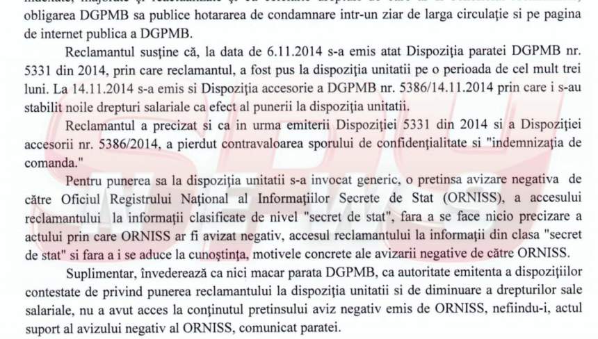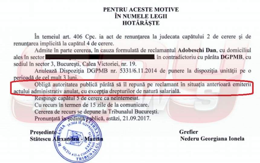 Dan Adobeschi, ofiţer pus la dispoziţie în urmă cu patru ani, după ce numele său a fost vehiculat în mai multe scandaluri, a câştigat în instanţă dreptul de a reveni în funcţia de şef de birou, demonstrând încă o dată că Poliţia Română este plină de profesionişti. Conform documentelor intrate în posesia jurnaliştilor SPYNEWS, Adobeschi fusese zburat din funcţie după ce ar fi fost prins accesând ilegal baza de date cu informaţii clasificate "secret de stat". Considerându-se victima unui abuz, Adobeschi a dat în judecată Poliţia Română, solicitând să fie repus în funcţie şi să i se dea, retroactiv, banii pe care i-a pierdut în perioada în care a fost suspendat.
