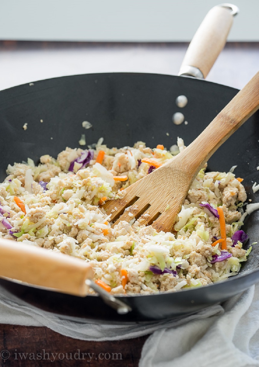 Se gătește carnea de pui într-o tigaie mare, la foc mediu, alături de ghimbir și usturoi. Se îndepărtează excesul de grăsime din tigaie și se adaugă amestecul coleslaw, ceapa verde, sarea, uleiul de susan și boiaua iute. Se gătește timp de câteva minute până ce varza și morcovul se înmoaie. Se taie aluatul în 20 de bucăți egale. Se adaugă câte o lingură din amestecul de pui și se împachetează. Se preîncălzește fripteuza la 190 de grade. Se prăjesc pachețele timp de aproximativ două minute până ce acestea capătă culoarea maro-aurie. Se scurg pe un prosop de hârtie. Se servesc imediat alături de sos Sweet Chili.