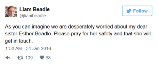 Liam Beadle, fratele tinerei scrie: "Aşa cum vă imaginaţi, suntem disperaţi şi îngrijoraţi pentru draga mea soră Esther Beadle. Rugaţi-vă ca ea să fie în siguranţă şi să ia legătura cu noi".