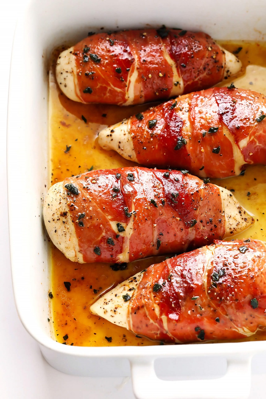 Se preîncălzeşte cuptorul la o temperatură de 180 de grade. Se înveleşte fiecare piept de pui cu 2/3 felii de prosciutto astfel încăt acesta să acopere întreaga suprafaţă a pieptului de pui, iar apoi se aşează într-o tavă de copt. Se asezonează piepţii de pui cu jumătate din cantitatea de unt, sare şi piper. Se introduce tava la cuptor şi se găteşte timp de aproximativ 20 de minute.