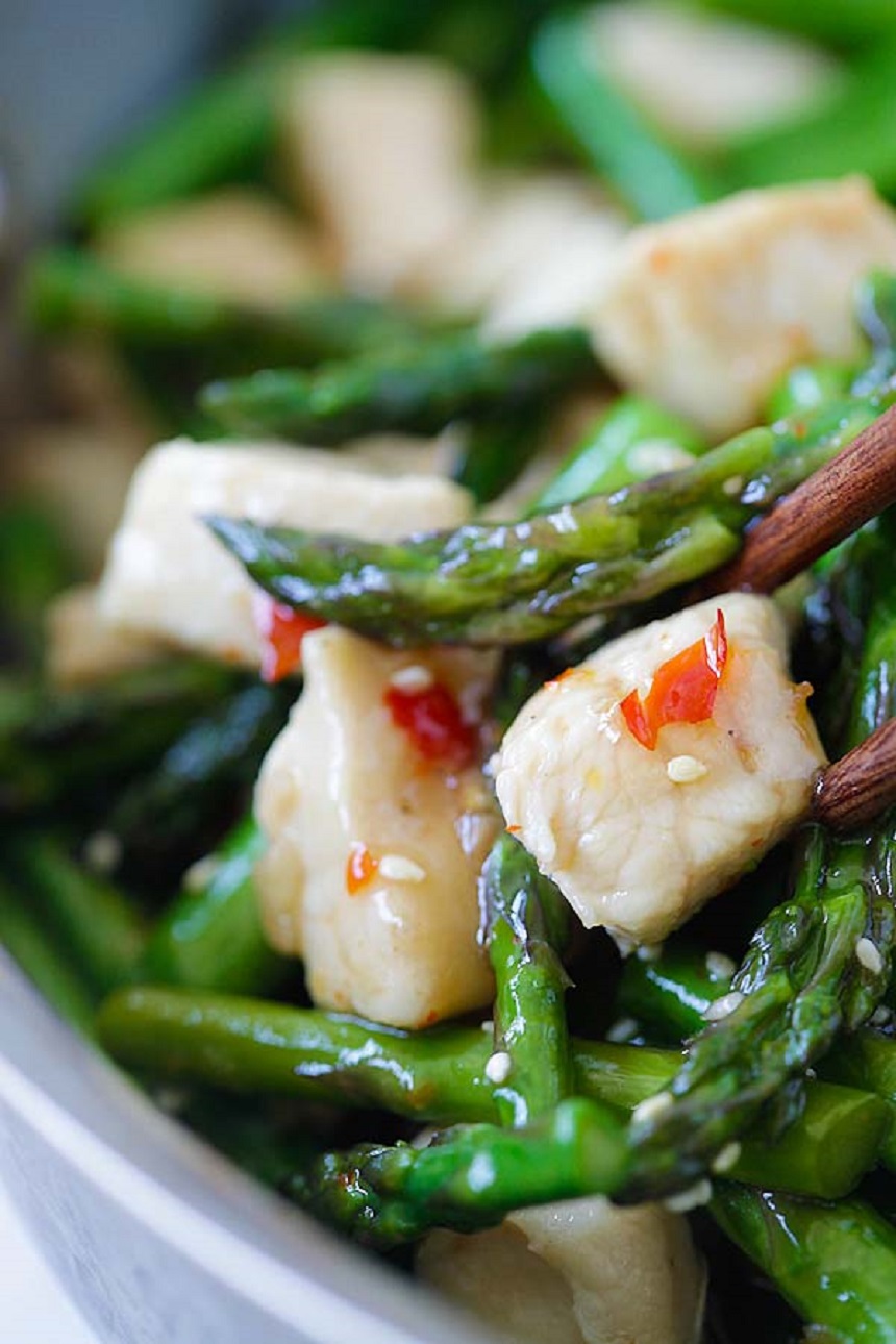 Într-o tigaie, la foc mediu, se încălzeşte uleiul. Se căleşte usturoiul timp de aproximativ un minut. Se adaugă puiul şi se găteşte aproximativ 4-5 minute. Gând puiul este gata se adaugă sparanghelul. Se găteşte timp de 2 minute. Apoi se adaugă sosul în tigaie şi se amestecă constant până ce acesta prinde consistenţă. Se serveşte imediat.
