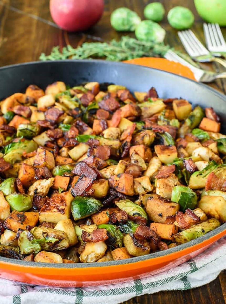 Se încălzește uleiul de măsline, într-o tigaie mare de fontă, la foc mediu. Se adaugă puiul, tăiat în bucăți mici împreună cu 1/2 linguriță de sare și 1/2 linguriță de piper. Se gătește aproximativ cinci minute până ce carnea nu mai are culoarea roz. După ce această este gata se transfera pe o farfurie și se lasă deoparte. Se reduce căldură și se adaugă baconul, în aceeași tigaie. Se gătește timp de aproximativ opt minute, iar după ce acesta s-a rumenit se transfera pe o farfurie și se lasă deoparte. Se adaugă două linguri de unt în tigaia de fontă și se pune varză de Bruxelles, cartoful dulce, ceapă și 1/2 linguriță de sare. Se călesc legumele, amestecând ocazional, timp de aproximativ 10 minute. Apoi se adaugă cubulețe de mere, usturoiul, cimbrul și 1/2 din cantitatea de supă. Se lasă să fiarbă aproximativ 2-3 minute până ce supa de pui se evaporează. Se adaugă bucățile de pui și restul de supă și se mai lasă să fiarbă timp de aproximativ două minute. La final se adaugă baconul, se amsteca până ce toate ingredientele se combină și se servește imediat.