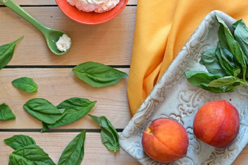 Se preîncălzește cuptorul la o temperatură de 200 de grade și se tapetează o tavă cu hârtie de copt. Într-o cratiță mică, la foc mediu se pune oțetul balsamic. Se gătește timp de 8-10 minute, iar apoi se lasă deoparte. Pe blatul din bucătărie se întinde aluatul, se unge, în mod uniform cu ulei de măsline, iar apoi se așează frunzele de busuioc și feliile de piersică, iar desupra se presară brânza. Se introduce în cuptor și se gătește timp de 10-12 minute, până ce blatul se rumernește. La final se asezonează cu reducția de oțet balsamic și se servește imediat
