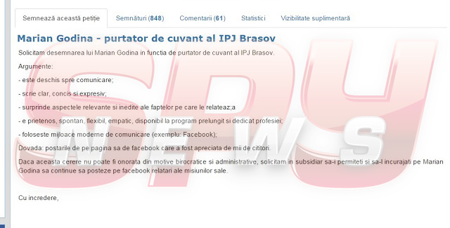 Mii de persoane au fost alături de agentul de circulaţie care a fost terorizat de şefi, fiind obligat să-şi închidă contul de Facebook unde postase mai multe povestiri despre întâmplările amuzante trăite de el în timpul serviciului. Mai nou, o susţinătoare a deschis o petiţie online în care solicită ca Marian Godina să fie promovat la Biroul de Presă al IPJ Braşov, în locul comisarului Liviu Naghi (foto jos), care ocupă în prezent funcţia de purtător de cuvânt.