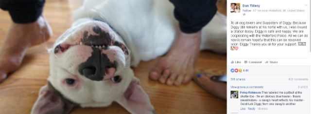 Potrivit oficialilor de la adăpostul de unde a fost luat Diggy există documente care arată că, de fapt, este bulldog american, nu pitbull. Mai mult, ei le-au cerut localnicilor să-i roage pe poliţişti să-i dea voie lui Dan să-şi păstreze prietenul patruped.