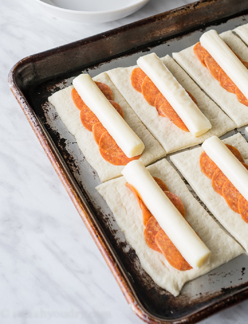 Peîncălziţi cuptorul la 230 de grade. Întindeţi aluatul de pizza pe o foaie de copt. Se taie coca în 10 dreptunghiuri de mărime egală. Se pun câte patru felii de pepperoni pe fiecare dreptunghi şi peste acestea se aşează câte un baston de brânză. Apoi se rulează fiecare dreptughi de în aşa fel încât ingredientele să fie bine acoperite. Într-un vas se topeşte untul li se amestecă cu praful de usturoi şi pătrunjelul. Cu ajutorul unei pensule se unge fiecare rulou de aluat. Se introduc în cuptor şi se gătesc aproximativ 10-12 minute, până ce rulourile capătă culoarea maro-auriu.