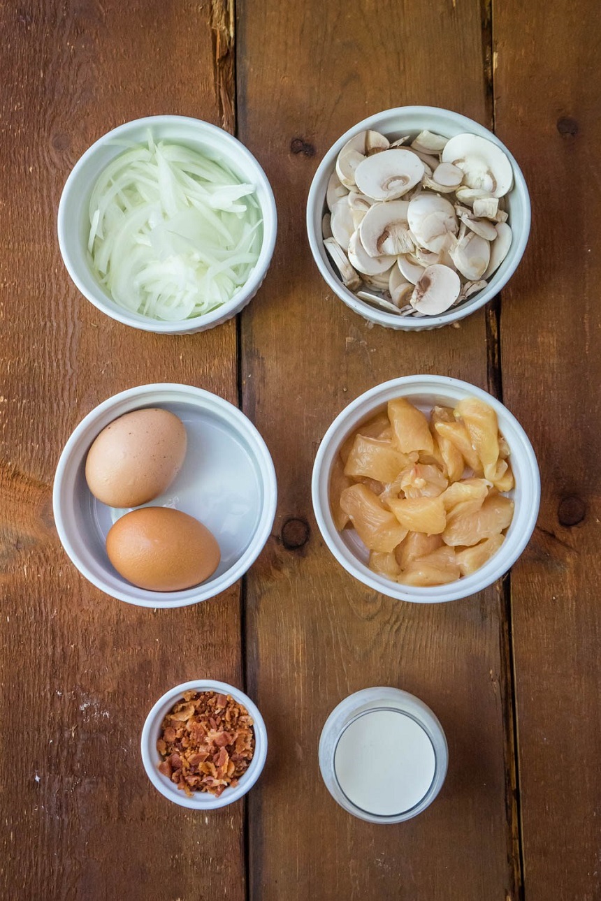 Amestecaţi ouăle împreună cu o cană smântână, sarea şi piperul. Se încălzeşte o tigaie la foc mediu. Când uleiul a ajuns la temperatura optimă, se toarnă amestecul de ouă, înclinaţi tigaia pentru ca acesta să fie uniform pe întreaga suprafaţă. Se găteşte la foc mediu timp de aproximativ două minute. După care în aceeaşi tigaie se adaugă carnea de pui, ceapa şi ciupercile şi se gătesc aproximativ cinci minute. Dupe ce acestea sunt gata în tigaia incinsă adaugaţi baconul şi o cană de smântână şi gătiţi până ce amestecul scade şi capătă consistenţă. Pe o farfurie se aşează omleta şi deasupra se adaugă carnea de pui împreună cu ciupercile şi ceapa. Iar lângă aceasta se aşează, într-un bol, amestecul cremos. Se serveşte imediat.