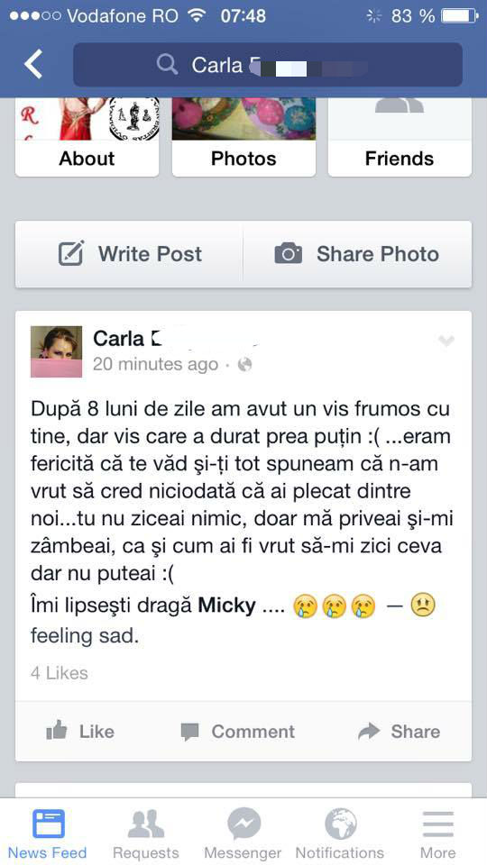 "După 8 luni am avut un vis frumos cu tine, dar a durat prea puţin. Eram fericită să te văd şi-ţi tot spuneam că n-am vrut să cred niciodată că ai plecat dintre noi. Tu nu ziceai nimic, doar mă priveai şi zâmbeai ca şi cum ai fi vrut să-mi zici ceva, dar nu puteai. Îmi lipseşti, dragă Micky!", a scris ea pe Facebook.