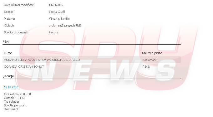 Liniştea dintre cei doi nu durat pare-se prea mult. Potrivit informaţiilor oferite de portalul instanţelor, în urmă cu câteva zile, magistraţii Tribunalului Ilfov au repus pe rol dosarul în care Elena Hueanu cerea stabilirea de urgenţă a domiciliului copilului pe care îl are cu Cristi Coandă. Următorul termen de judecată a fost stabilit pentru jumătatea lunii mai.