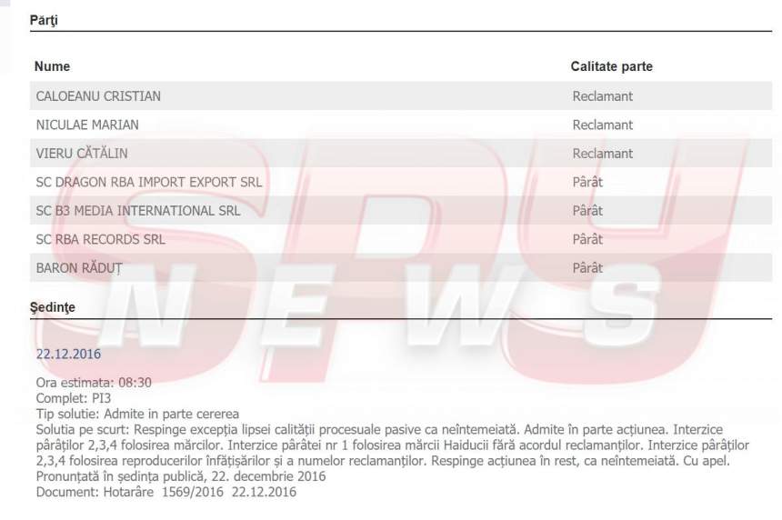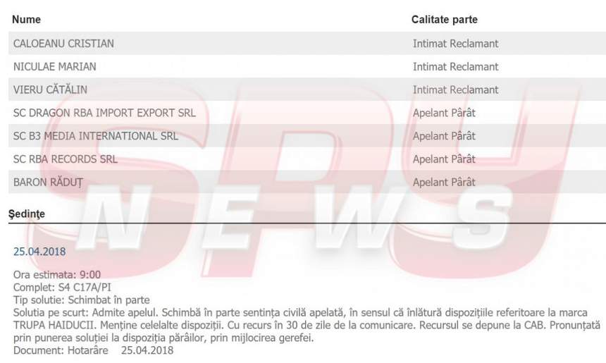 "Admite apelul. Schimbă în parte sentinţa civilă apelată, în sensul că înlătură dispoziţiile referitoare la marca TRUPA HAIDUCII. Menţine celelalte dispoziţii. Cu recurs în 30 de zile de la comunicare", au dispus judecătorii.