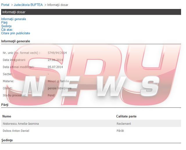 Se pare că fiul fotbalistului nu a putut să-şi îndeplinească obligaţiile de tată şi a fost chemat în faţa instanţei pentru pensie alimentară. "Nu este o sumă foarte mare pe care trebuie să îi dea pe lună. Sunt doar 100 de lei, dar nici pe ăştia nu-i dă. A plătit doar o dată de când s-a terminat căsătoria", ne-a mai spus sursa noastră. Dosarul a fost înregistrat la Judecătoria Buftea pe 27 iunie, însă nu a fost stabilit încă termenul de judecată.