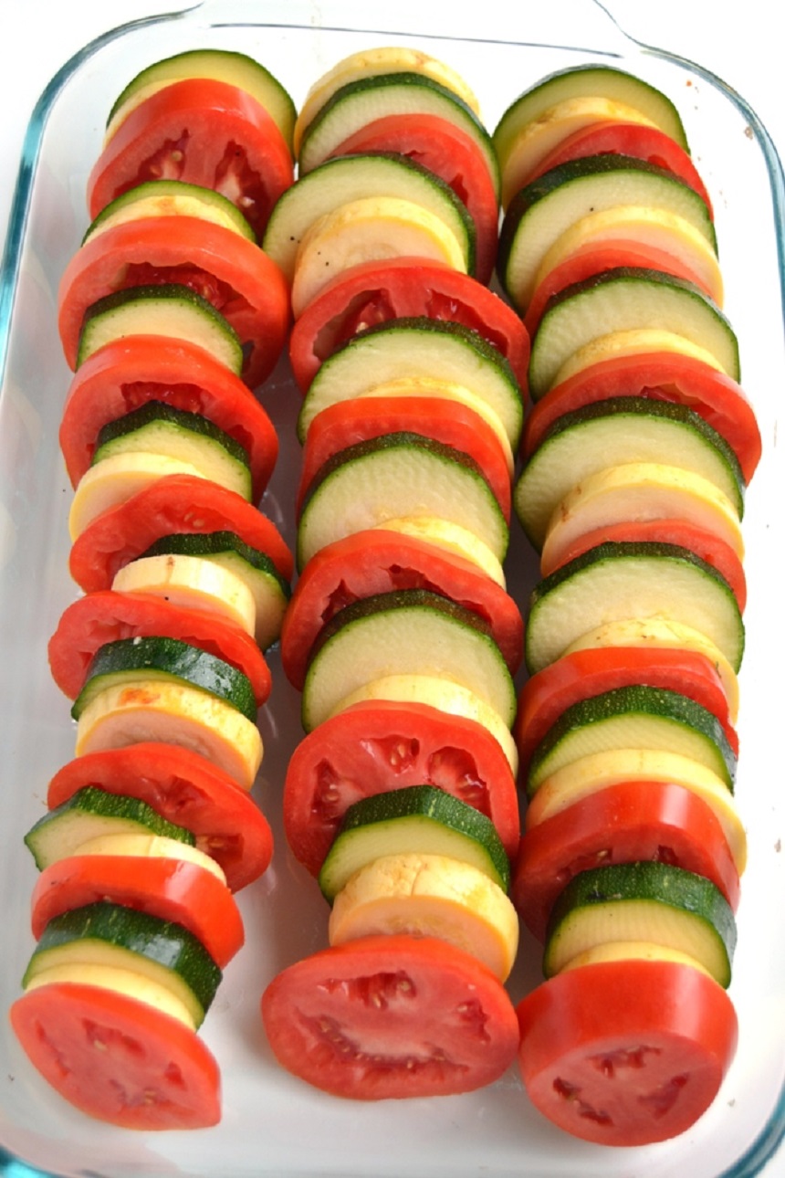 Preîncălziţi cuptorul la temperatura de 170 de grade. Într-o tavă se aranjează legumele într-un mod alternativ, iar deasupra se presară parmezanul şi mirodeniile. Se introduce la coptor şi se coace timp de 25-30 de minute, până ce dovlecelul este moale. Se serveşte imediat.