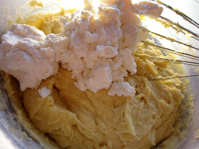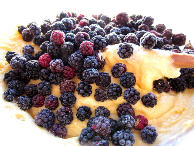 Se toarnă apoi ingredientele solide peste cele lichide și se amestecă până la omogenizare, nu mai mult. Se încorporează în aluatul obținut ricotta bine scursă, dar şi murele sau fructele asortate care se pot pune fără a fi dezgheţate.