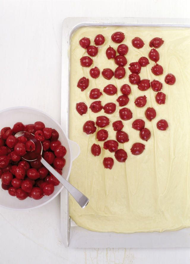 Etapă 5: Cu această budincă umplem mintartele. Deasupra repartizăm cireșele pe care le scoatem înainte din sirop și le lăsăm puțin să se scurgă.