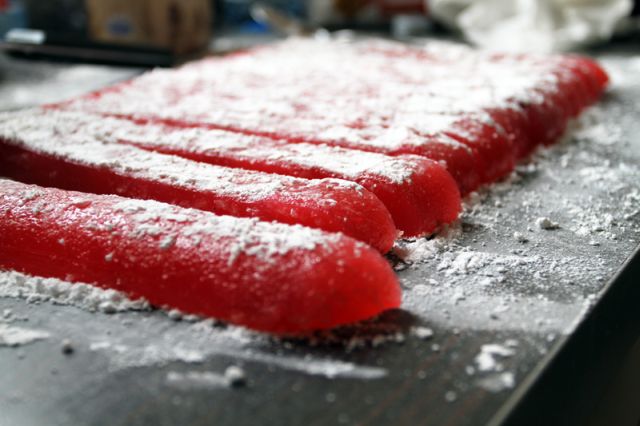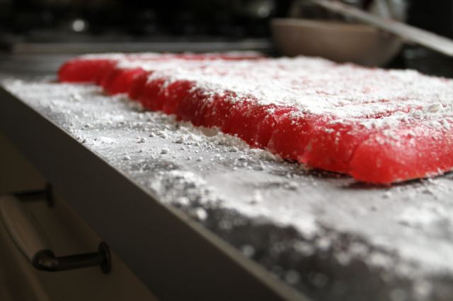 Trebuie să ungem cu ulei o formă de 23cm x 23 cm şi o tapetăm cu hârtie de copt, pe care o ungem cu ulei la rândul ei. Într-o cratiţă amestecăm zahărul, 375 ml apă şi zeama de lămâie şi o punem pe foc. Amestecăm până se topeşte zahărul. Lăsăm amestecul să fiarbă la foc mic timp de 45 min – 1 oră, până ajunge la 115°C sau până capătă o culoare aurie, apoi luăm de pe foc. Într-o altă oală, cernem amidonul, adăugăm 500 ml apă şi amestecăm cu un tel până se omogenizează şi se îngroaşă.