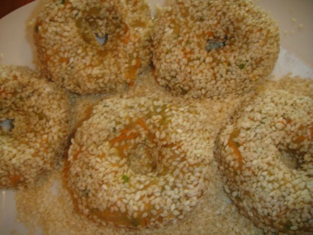 Se umezesc mâinile cu apă și se formează biluțe pe care le străpungi cu degetul pe mijloc. Se tăvălesc prin susan, apoi se rumesc în ulei încins. Pot fi servite calde sau reci ca aperitiv.