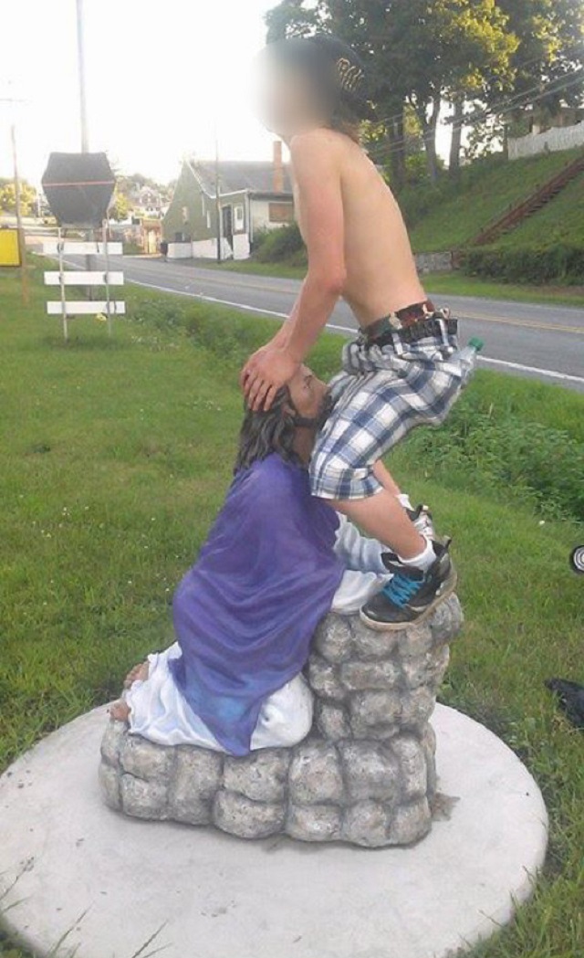Tânărul, în vârstă de 14 ani, a mimat o scenă de sex oral cu o statuie care îl înfățișează pe Iisus Hristos rugându-se. Mândru de isprava sa, și-a rugat un prieten să-l pozeze apoi a publicat imaginea pe Facebook.