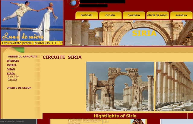"Exclusivitate pentru îndrăgostiţi! Petreceţi luna de miere în Siria!", îi îmbie pe potenţialii clienţi reprezentanţii unei agenţii. Şi, ca să demonstreze că sejurul este un chilipir, specialiştii în turism explică faptul că preţurile variază între 650 şi 1.000 de euro de persoană, pentru opt zile de vacanţă. Timp în care românii pot vizita mănăstirile creştine, Marea Moschee şi cetăţile din Alep, Damas, Palmyra: "Vizita oraşului Pamyra include: Templul lui Bel, Teatrul, Agora şi mormintele. După-amiaza - întoarcere la Damasc, cu oprire pe muntele Qasioun, pentru o vedere panoramică asupra oraşului".
